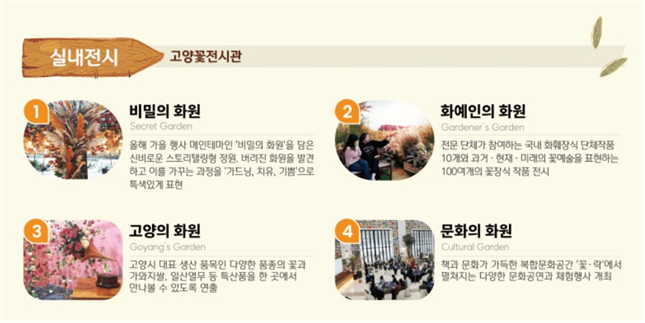 - 행사내용(실외) : 경기도농업기술원과 함께하는 선인장, 다육 전시(선인장 페스티벌), 시민참여정원, 고양플라워 마켓, 수상 꽃 자전거, 체험 이벤트 등