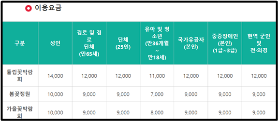 - 요금 : 성인 10,000원, 경로 및 단체: 9,000원, 유아. 청소년 8,000원