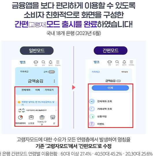 - '23년 6월 말 기준, 모든 국내 은행(18개사)에서 고령자 모드 출시가 완료