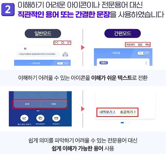 2) 이해하기 어려운 아이콘이나 전문용어 대신, 직관적인 용어 또는 간결한 문장을 사용