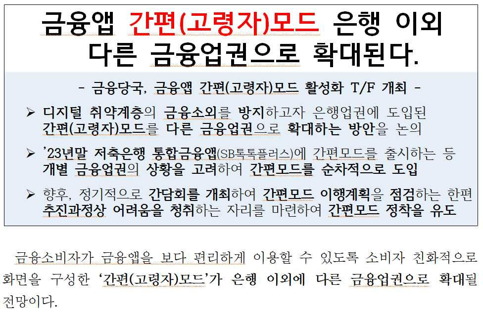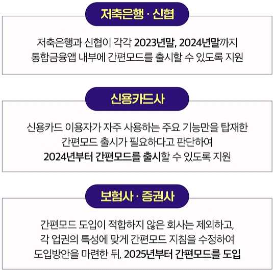 - 간편 모드를 우선적 도입할 수 있는 업권으로 저축은행과 신협을 선정하고, 저축은행과 신협이 각각 '23년 말, '24년 말까지 통합 금융앱 내부에 간편 모드를 출시할 수 있도록 지원