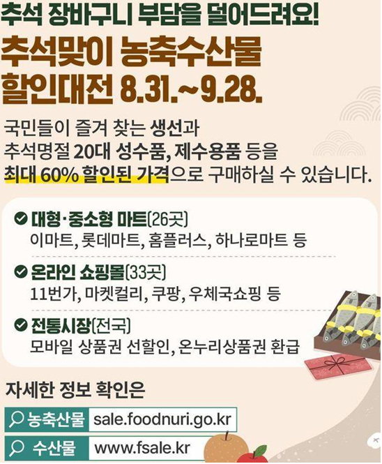 그래서 정부에서 추석 성수품 수급 안정 대책 마련하여, 추석 장바구니 부담을 덜어드리는 '추석맞이 농축 수산물 할인 대전' 등을 위시한 여러 대책 등을 마련하여 진행하고 있는 걸로 보입니다.
