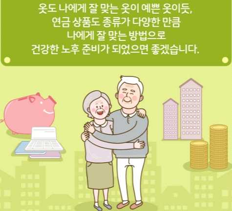 옷도 나에게 잘 맞는 옷이 예쁜 옷이 있듯이 연금 상품도 종류가 다양한 만큼, 가족들에게 부담을 주지 않고 나에게 잘 맞는 방법으로, 건강한 노후 준비가 잘되게 꾸려서 행복한 노년의 삶을 영위해 나갔으며 좋겠습니다.