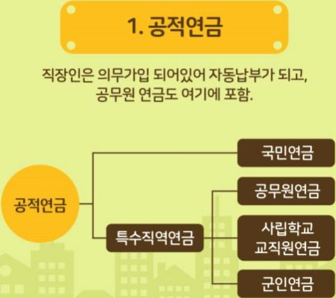 ☛ 공무원 · 군인 · 별정 우체국 · 사학 연금과 보통 회사원들이 매달 내고 있는 고용보험에 속하는 국민연금, 공무원연금이 여기에 포함. 직장인은 의무 가입되어 있어 자동 납부