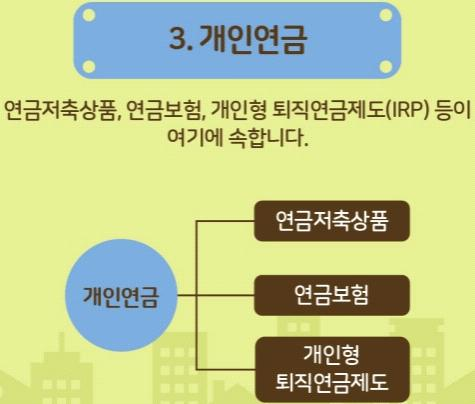 - 프리랜서 등 개인 스스로가 자신의 노후를 준비하는 제도. 주택을 담보로 연금을 받는 주택연금, 65세 이상이 받는 기초연금, 연금 저축 상품, 연금보험, 개인형 퇴직연금제도(IRP) 등이 있음