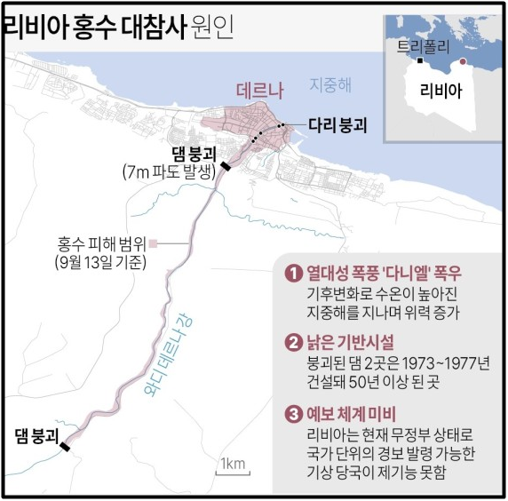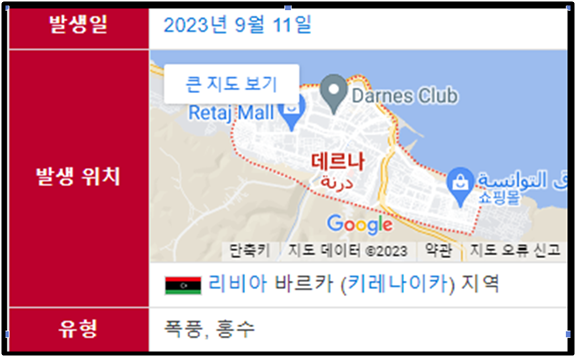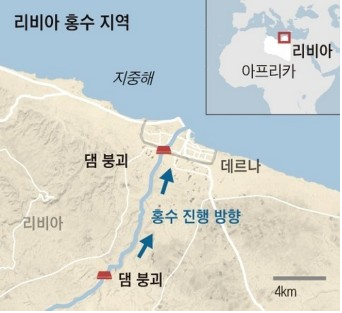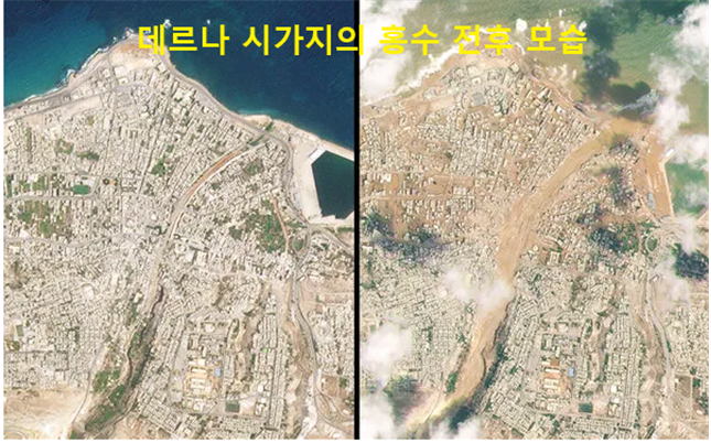 - 이에 데르나로 향하는 길목에 자리한 댐 2개가 무너지며 데르나 지역이 완전히 침수