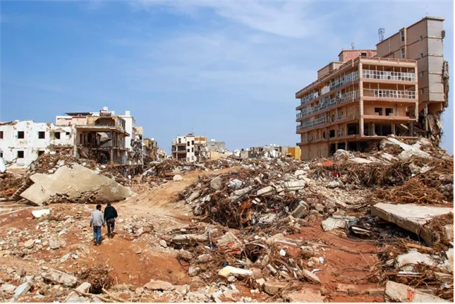 - 와디 데르나의 두 댐이 수압을 견디지 못하고 붕괴하자, 데르나 시가지의 저지대는 초토화