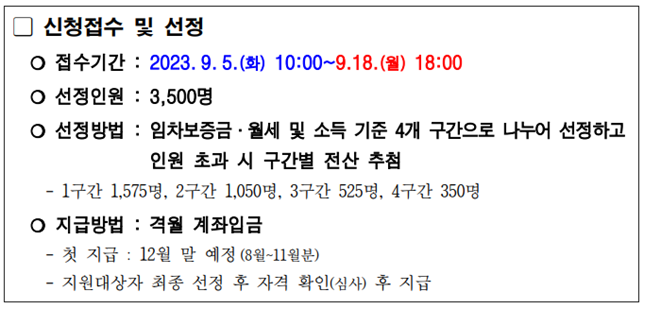 - 임차보증금, 월세, 소득 기준에 따라 4개 구간으로 나누어 총 3,500명을 선정