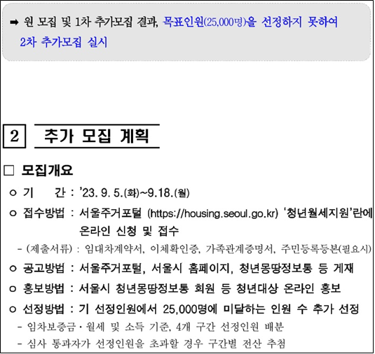 - 추가적인 신청에 필요한 사항은 서울 주거 포털 사이트 내 공지 사항을 확인