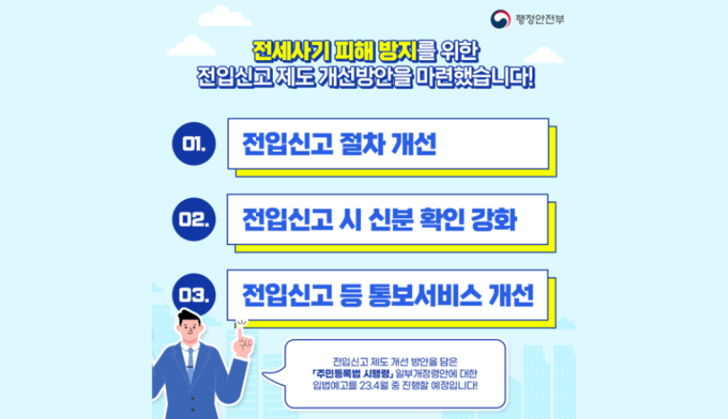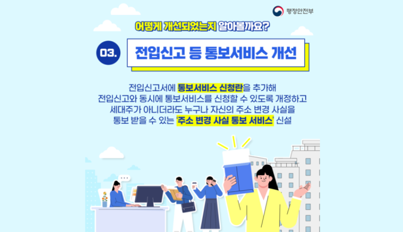 - 전입신고 시 전입자의 확인 의무화, 전입신고 시 신분 확인 강화, 주소변경 사실 통보 서비스 신설, 전입세대 확인서 개선 등