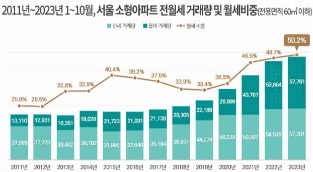 2023년 1~10월 서울 소형 아파트(전용면적 60㎡ 이하 규모) 전월세 거래량은 11만 4,962건으로 역대 최고치를 기록했습니다. 이 중 월세가 절반을 차지했는데 월세 비중이 갑자기 높은 이유로는, 전세 사기가 불안감을 자극 영향이라고 합니다.