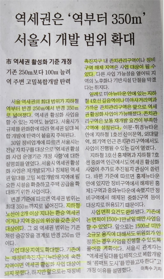 1) 서울 역세권의 최대 범위가 지하철역부터 반경 250m에서 350m로 확대