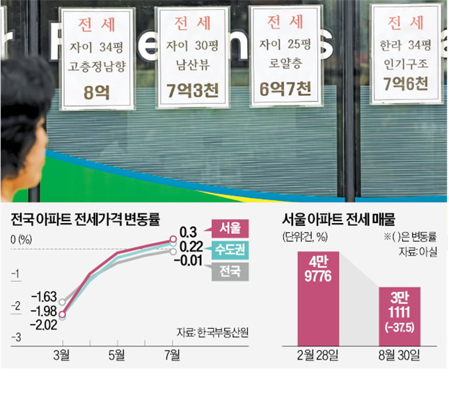 1) 8월 31일 기준, 서울 아파트 전세 매물은 3만 1,111건으로, 여섯 달 전(4만 9,776건)과 비교해 37.5% 감소