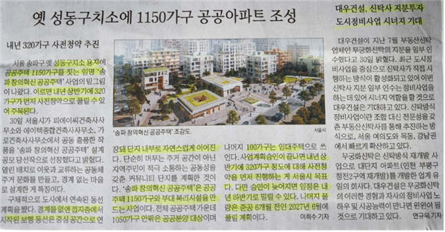 - 서울 송파구 옛 성동 구치소 용지에 공공 주택 1,150 가구를 짓는, 일명 '송파 창의혁신 공공 주택' 사업 계획(이르면 내년 상반기에 320 가구가 먼저 사전청약으로 풀릴 가능성 제기)
