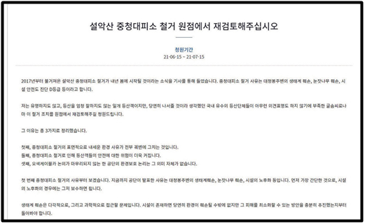 4) 그러나 중청대피소의 숙박시설 기능이 사라지면, 설악산 대청봉을 등반하는 탐방객들의 안전에 위험이 뒤따를 수 있다는 지적이 나옴