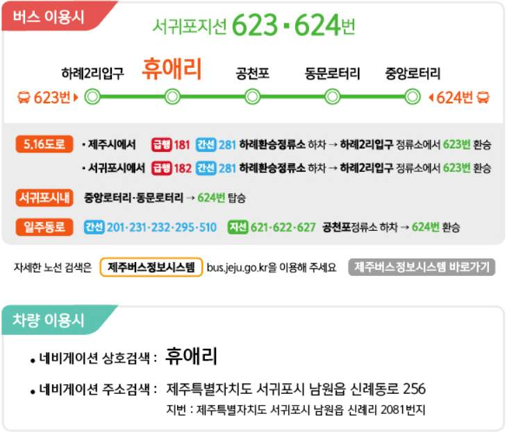 - 내비게이션으로 주소 검색 : 제주특별자치도 서귀포시 남원읍 신례동로 256(지번: 제주특별자치도 서귀포시 남원읍 신례리 2081번지)