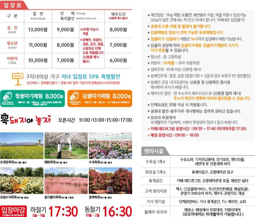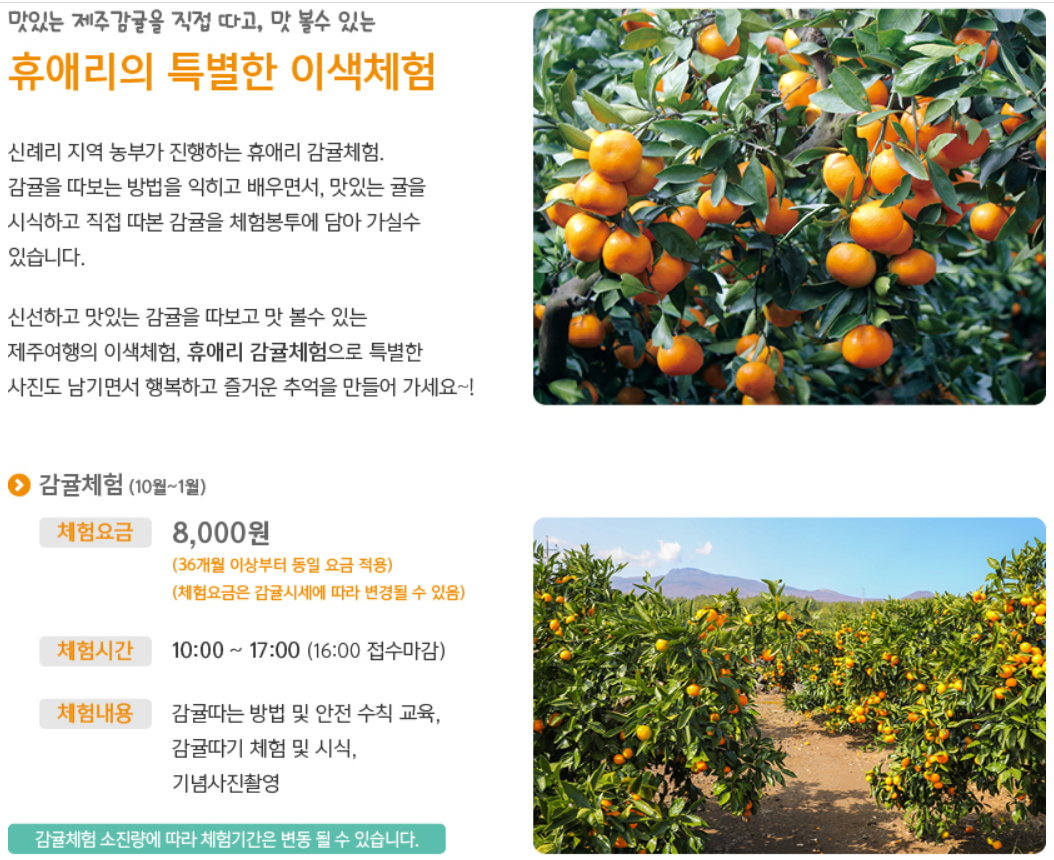 - 입장 시간 16시까지, 감귤 따는 체험 가능