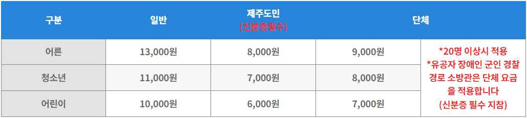 - 영유아 35개월까지 무료입장, 세 자녀 가족 50% 할인(자녀만 할인 혜택, 고등학생까지)