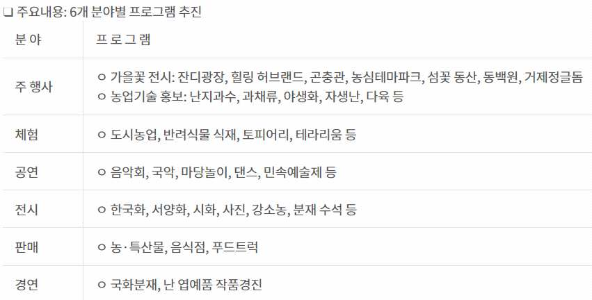 - 공연, 문화예술 전시, 농ㆍ특산물 판매, 음식점 운영 등