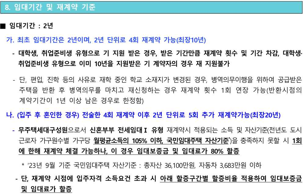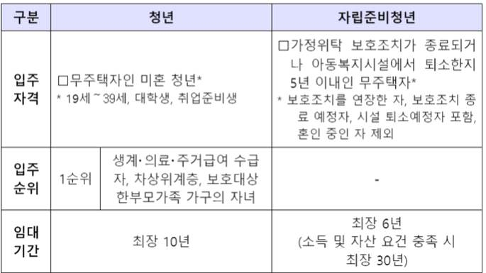 - 청년 최장 10년, 자립 준비 청년 최장 6년(모두 소득, 자산 요건 충족 시는 최장 30년 가능)