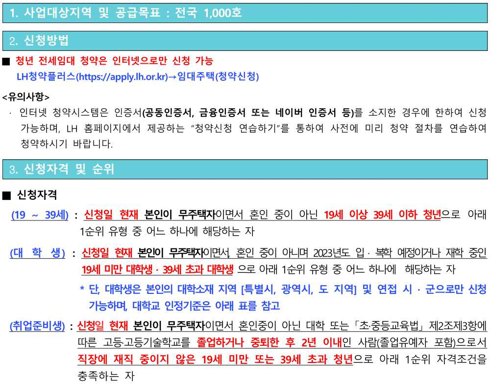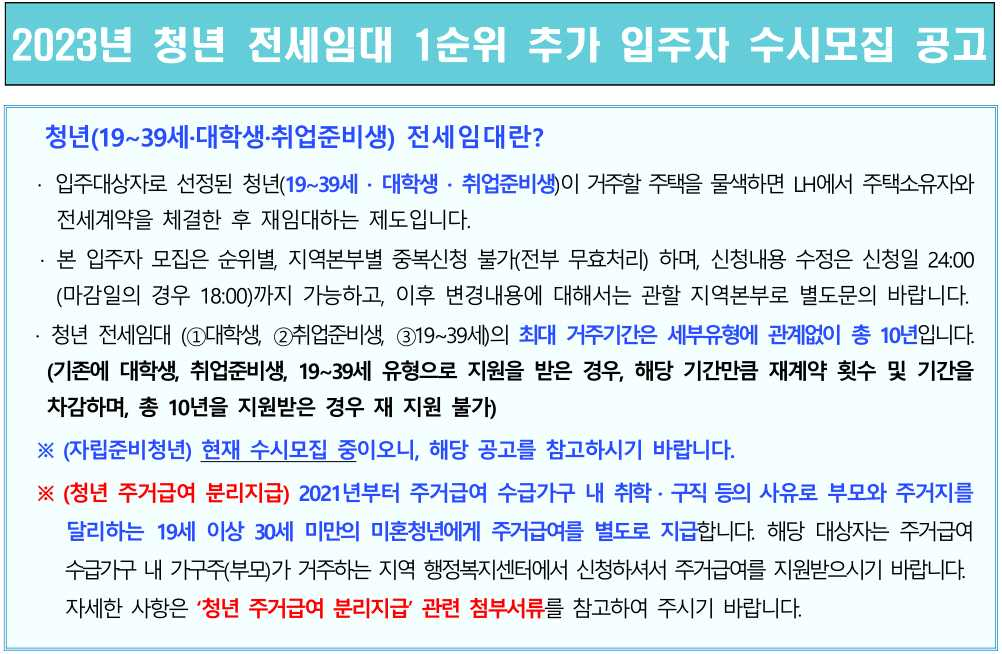 - 청년층(대학생 취업준비생만 19세~39세)의 주거비 부담 완화를 위해 기존 주택을 전세 계약 체결하여 저렴하게 재임대하는 공공임대주택