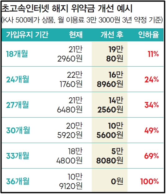 - 3년 약정 시 월 이용료가 3만 3,000원인 K사의 500 메가 상품의 경우, 24개월 차 위약금이 22만 2,000원이던 것이 16만 9,000원(24% 인하)