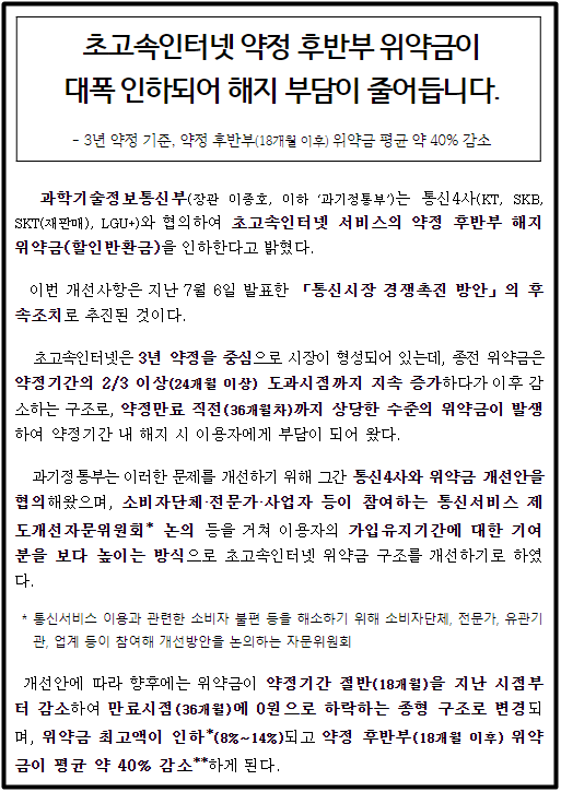 한편 이번 개선사항은, 지난 7월 6일 과기정통부가 발표한 '통신 시장 경쟁 촉진 방안'의 후속 조치로, 초고속인터넷 위약금 구조를 개선하고자 추진됐다고 합니다.