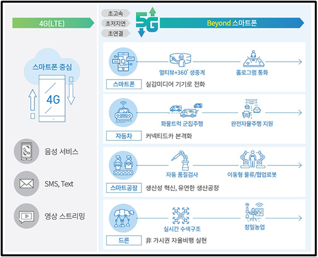 - 5G는 사람과의 음성. 데이터 통신을 넘어서 모든 사물을 연결하고, 혁신적 5G 융합 서비스와 첨단 단말기기 등 신산업 창출을 가능케 함