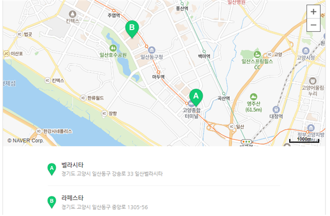 - 주소 : 벨라시타-경기도 고양시 일산동구 강송로 33, 라페스타-경기도 고양시 일산동구 중앙로 1305-56
