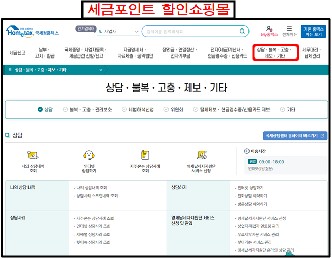 - 쇼핑몰을 들어가는 방법 : 홈택스의 세금 포인트 쪽에서, 세금 포인트 할인쇼핑몰 안내로 들어감