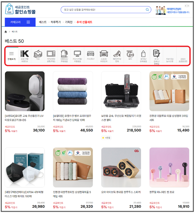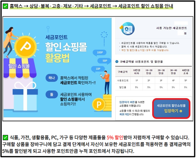 - 세금 포인트를 사용하여 우수한 중소기업 제품을 5% 할인 구매 가능
