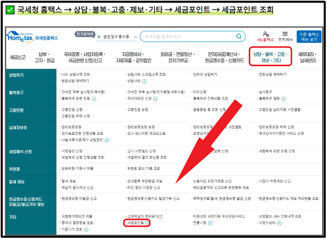 - 국세청 홈택스 오픈 → 홈택스 로그인, 우측 상단의 상담. 불복. 고충. 제보. 기타를 클릭 → 기타란에 세금 포인트 관련 내용에, 세금 포인트 조회 클릭 → 세금 포인트를 조회