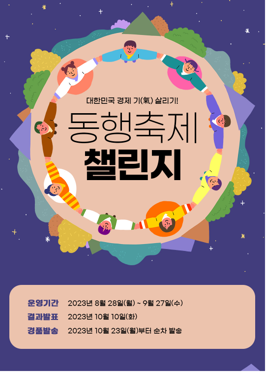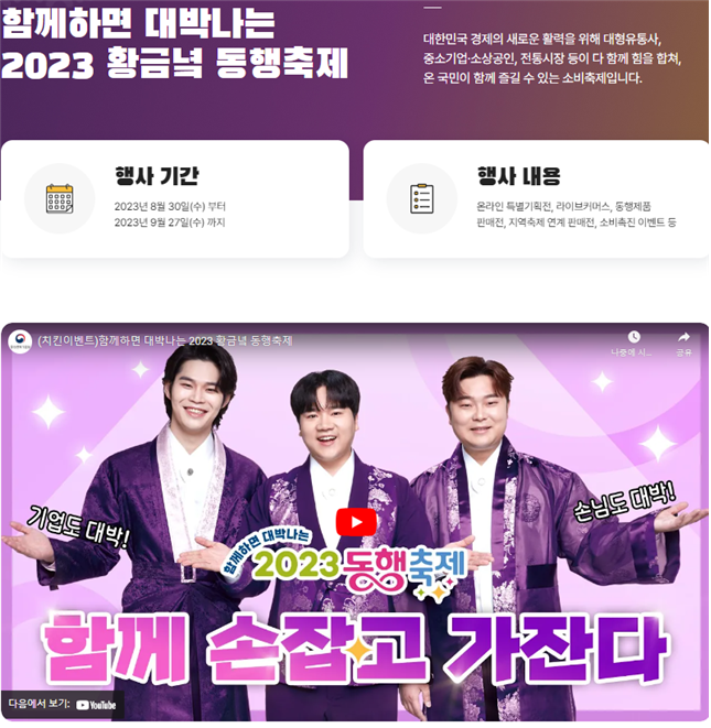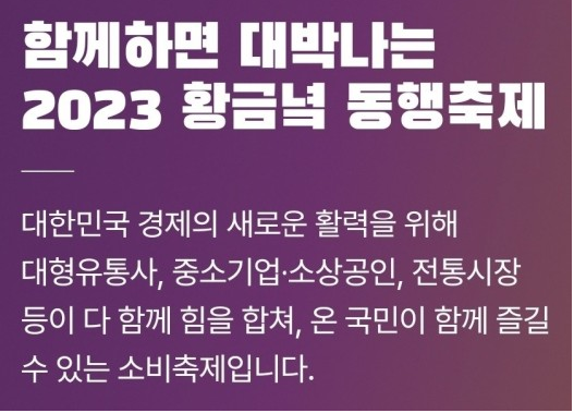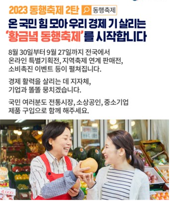 경제활력의 일환으로, '온 국민이 소비의 힘을 모아, 우리 경제의 기(氣)를 살리자'라는 취지의 경제활력 운동인 '2023년 9월 황금 녘 동행 축제'의 서막이, 지난 8월 30일부터 9월 27일까지 29일간 열리게 됩니다.
