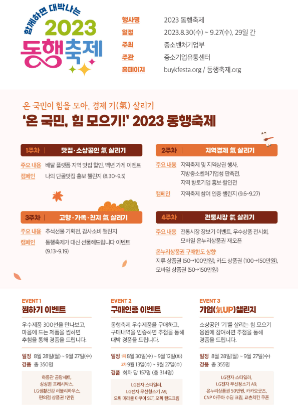 1) 2020년부터 시작된 동행 축제는 그동안 위축된 소비심리를 살려 중소기업. 소상공인 제품 판매를 촉진하는 소비행사로 추진
