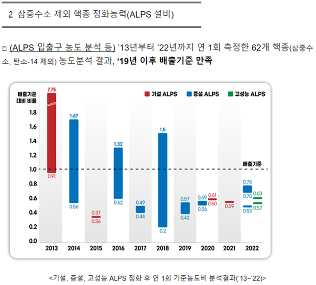 - 후쿠시마 원전에서 발생 오염수는 알프스를 통해 정화되지만, 일부 방사성 물질은 여전히 남아 있어 해양 생태계 등에 미칠 영향에 대한 우려가 여전히 남아 있음 (알프스 설비의 성능 등에 대한 의문도 제기)