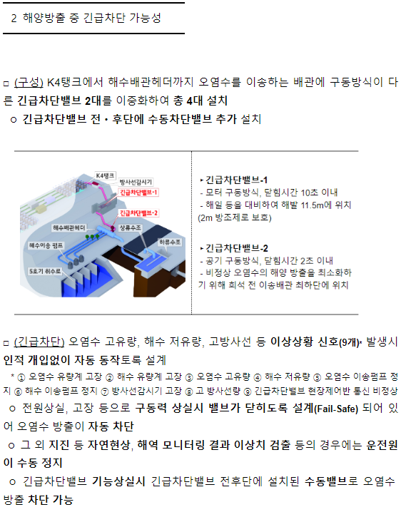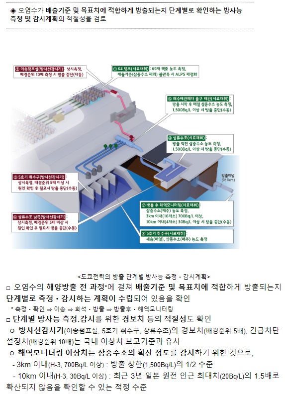 - 일본은 "방류되는 모든 다핵종 제거설비(ALPS) 처리수는, 도쿄전력과 제삼자에 의해 측정되며, 결과는 방류 전에 공표될 것"이라고 설명