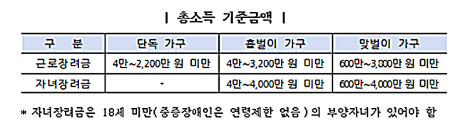 - 부부합산 연간 근로소득 합계액이 가구원 구성에 따라 정한 총소득 기준 금액 이하라야 함