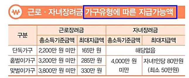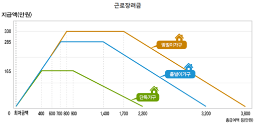 ▷ 올해 정부 세법 개정안엔 근로장려금 최대 지급액이 바뀌었음