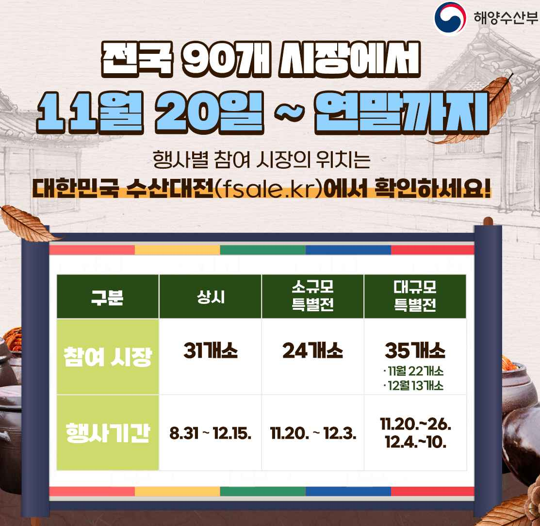 해양수산부는 20일부터 연말까지 김장철을 맞아 '대한민국 수산대전-온누리상품권 환급행사'를 확대 개최한다고 밝혔습니다.